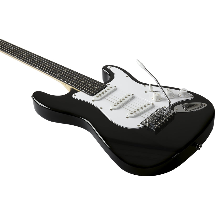 La S-100 3/4 Black è la chitarra elettrica con misura 3/4 della serie "Tribute Starter" di Eko Guitars. È costruita con corpo in Pioppo, manico in Acero e tastiera 21 tasti in resina Eko WPC. Con una lunghezza di scala da 580 mm e capotasto da 42 mm, è equipaggiata con tre pickup single coil gestibili tramite controlli di volume, due toni e switch blade a 3 vie. La chitarra elettrica ideale per i bambini che iniziano il percorso di studi e che desiderano cominciare dalla chitarra elettrica, ad un costo abbordabile.