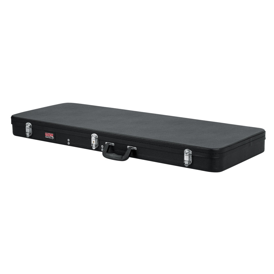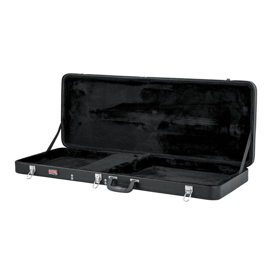 La Gator GWE-JAG fa parte della serie Traditional, che offre al chitarrista custodie rigide robuste dal look vintage. La struttura in compensato è molto resistente, e il rivestimento in Tolex PVC offre una protezione contro l'umidità. La spessa fodera in peluche protegge la chitarra da urti e graffi, e il manico poggia su un alloggiamento confortevole. Le chiusure cromate con serratura aumentano la sicurezza. Progettata per adatatrsi a chitarre elettriche in stile Flying V, Explorer o altri modelli con forme offset estreme.