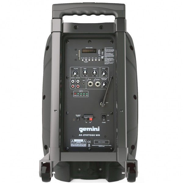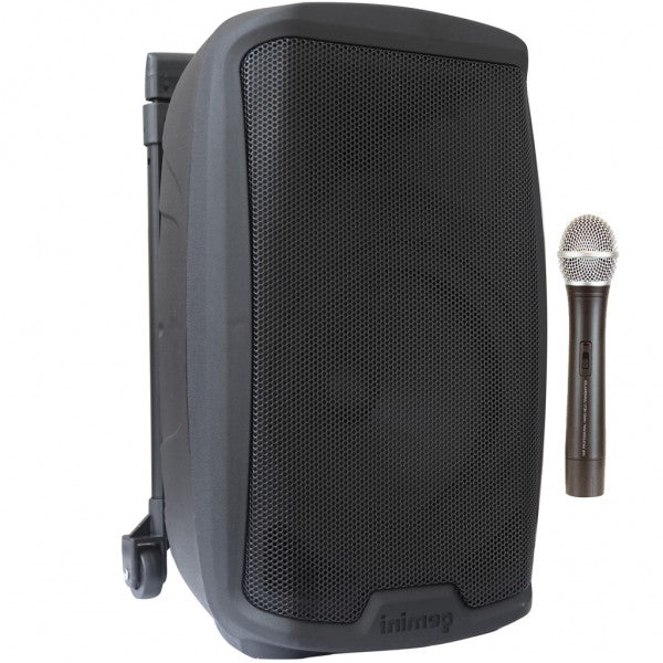 Diffusore portatile amplificato alimentazione a corrente e a batteria con trolley – 2 vie da 1000 W di picco – 40–19.000 Hz – tweeter da 1.2" – woofer da 10" – 1 ingresso microfonico + 1 ingresso microfonico/instrument con volume separato + 1 ingresso AUX – master generale con regolazione separata di alti, bassi ed echo – in/out per collegamenti in cascata – 1 radiomicrofono UHF 863-865 MHz – lettore USB ed SD card – ricevitore Bluetooth per collegare qualunque sorgente esterna in wireless (Bluetooth) – il lettore ha le seguenti funzioni: play/pause/ffww/rew oltre allo skip della traccia e alla funzione random play – alimentazione a 12 V e a 220 V – cabinet in abs full grill