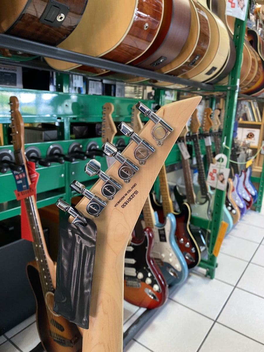 Tastiera in acero con bordi smussati, raggio compound 12˝-16˝ (30,48 - 40,64 cm), con 24 tasti jumbo e intarsi a pinna di squalo neri invertiti