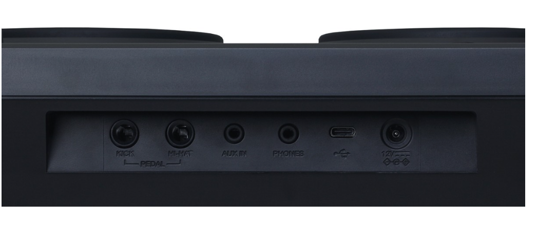 Connessioni: 1 x USB-C (MIDI), Cuffia / Uscita jack (1 x 1/8”), Jack Aux-in (1 x 1/8”), Pedali controllo Kick & Hi-Hat