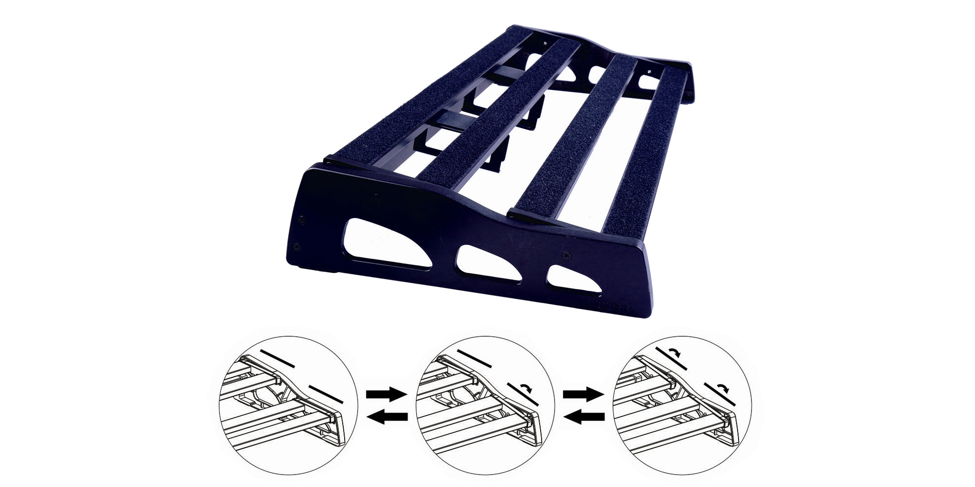 Le pedaliere della serie TF sono caratterizzate da una configurazione variabile delle due piattaforme su cui appoggiare i pedali, che permette di modificarne facilmente l’angolo di inclinazione in modo da poter ospitare diversi layout e dimensioni di pedali. L’ampia area disponibile sotto la pedaliera stessa, permette di tenere tutto il cablaggio perfettamente in ordine e collegare facilmente i pedali, mantenendo una chiarezza visiva nella parte superiore!