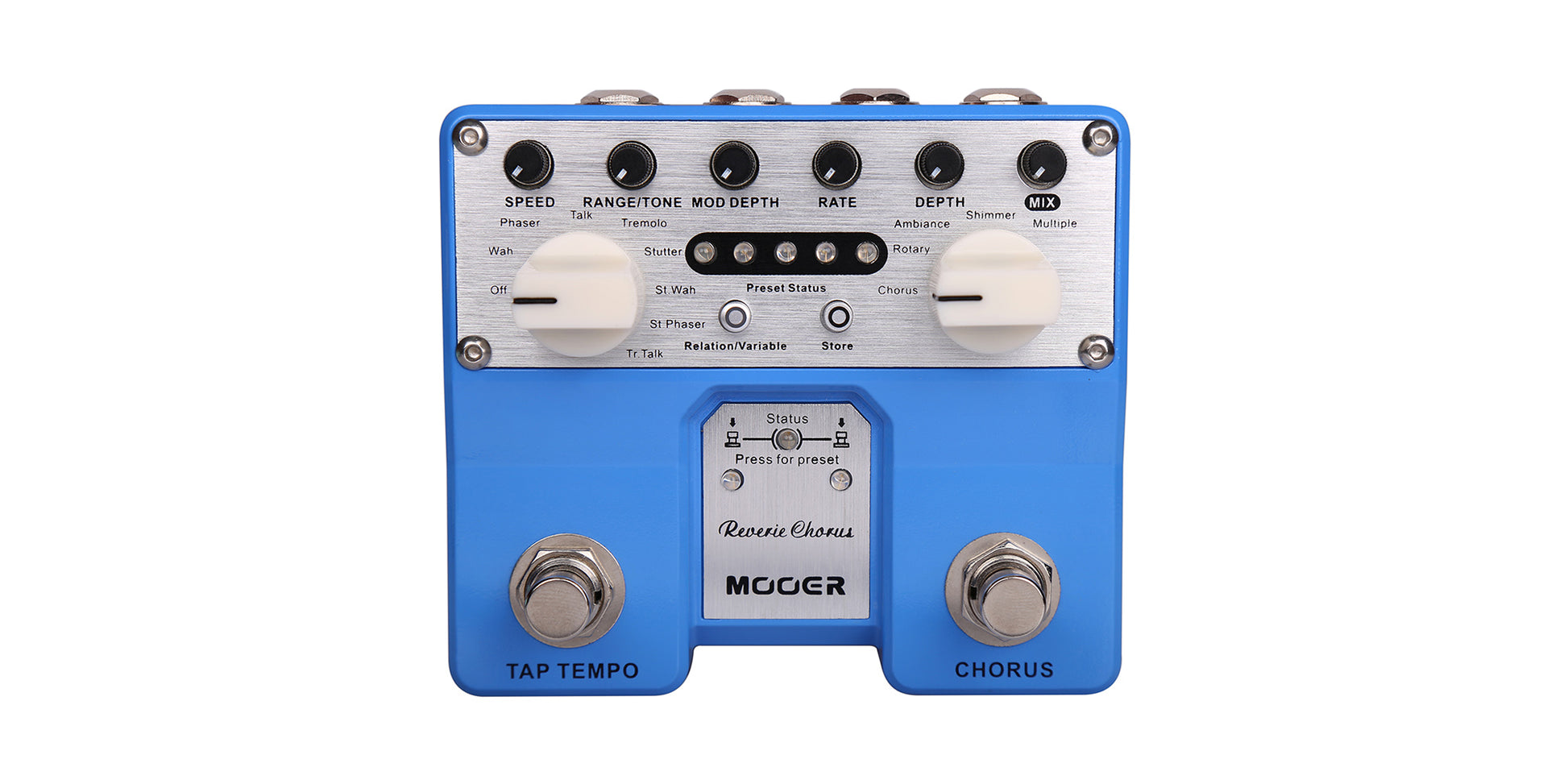 Il Reverie Chorus è un nuovo modello della Mooer Twin Series, linea dalle caratteristiche eleganti, professionale, versatile, e dal grande rapporto qualità prezzo. Il Reverie Chorus si dedica al mondo delle modulazioni; sulla base di 5 tipologie di effetto, Chorus, Rotary, Ambiance, Shimmer e Multiple, è infatti possibile aggiungere rispettivamente 8 effetti diversi di modulazione: Wah, Phaser, Talk, Tremolo, Stutter, St.Wah, St.Phaser, Tr.Talk. Per esempio, è possibile aggiungere un effetto Wah nel Chorus; oppure aggiungere un Phaser al Rotary per ottenere un effetto più ampio; sommare un Tremolo ad Ambiance per una sonorità grave e psichedelica, e così via. Cinque controlli, Speed, Range/Tone, Mod Depth, Rate, Depth, Mix, permettono inoltre di scolpire il proprio suono nella maniera desiderata. La speciale funzione Relation / Variable, permette inoltre di ottenere ben otto tipi di Rate differenti.