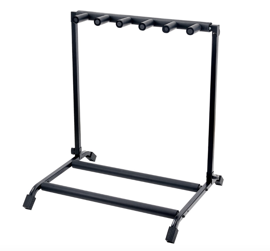 Supporto per 5 chitarre pieghevole, in metallo con rifiniture in gomma antigraffio. Leggero ma stabile grazie alle staffe di rinforzo sul telaio, ideale per essere trasportato ovunque col minimo sforzo e ingombro.Provvisto di piedini in gomma antiscivolo e antigraffio.Adatto a chitarra classica, acustica, elettrica, basso.