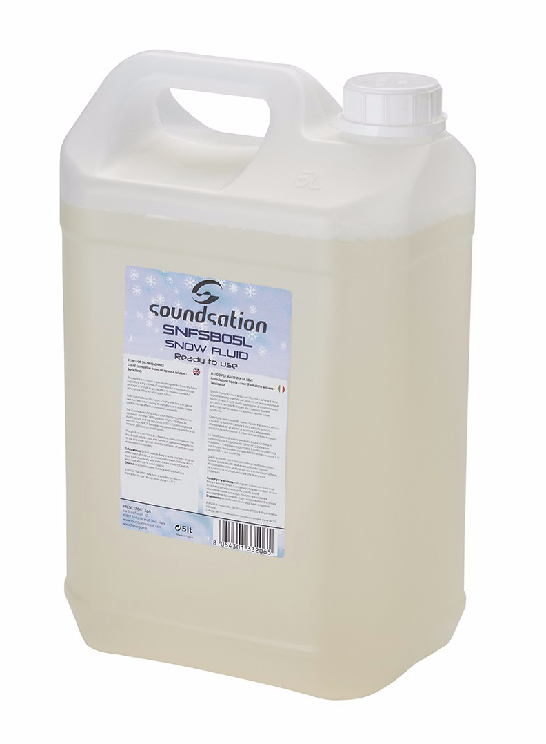 SOUNDSATION SNFSD05L Fluido per Neve è un fluido a base d'acqua e tensioattivi non ionici per Macchina da Neve appositamente progettato per produrre un grande volume di fiocchi di neve in tutte quelle applicazioni di intrattenimento sui palchi o nei club, finalizzate alla creazione di effetti ambientali dall’atmosfera meravigliosa. È pronto all’uso. ha una buona persistenza dei fiocchi di neve e una efficienza molto elevata. Il colore è neutro e in caso di contatto con tessuti o altre superfici è sufficiente lavare con acqua. ll profumo è neutro e piacevole e non lascia traccia dopo la dissoluzione. Il SNFSD05L è realizzato secondo rigorosi processi di produzione e severi controlli durante tutte le sue fasi, e soddisfa tutti i requisiti normativi europei. È disponibile in taniche da 5 litri.